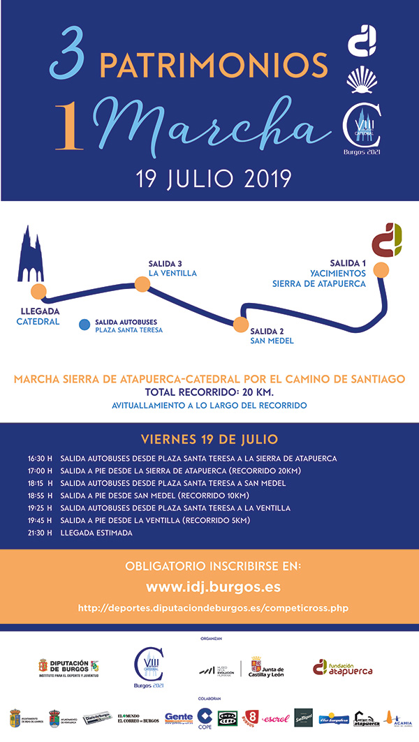 El 20 de julio de 1221 se puso la primera piedra para construir la catedral de Burgos, en 2021 se cumplirán 800 años. Para conmemorar este hecho, la Diputación de Burgos, junto con la Fundación del VIII Centenario de la Catedral, la Fundación Atapuerca y el Museo de la Evolución Humana celebrará el 19 de julio una Marcha a pie desde los Yacimientos de la sierra de Atapuerca, pasando por el Camino de Santiago y finalizando en la Catedral, uniendo así los tres Patrimonios Mundiales de nuestra provincia.