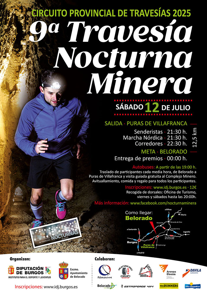 La localidad de Belorado será escenario este sábado, 12 de julio, de una nueva edición de la Travesía Nocturna Minera, una propuesta deportiva y cultural que une deporte, patrimonio y naturaleza bajo la luz de la luna. Esta será la cuarta prueba del XI Circuito Provincial de Travesías Nocturnas “Diputación de Burgos”, iniciativa promovida por el Instituto Provincial para el Deporte y Juventud (IDJ) para dinamizar la actividad física en el medio rural.