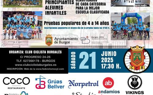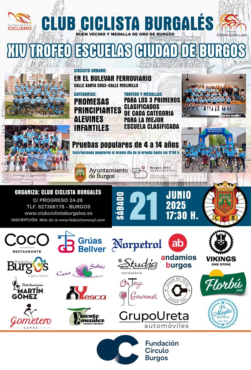 El próximo sábado 21 de junio, a partir de las 17:30 horas, la ciudad de Burgos será escenario del XIV Trofeo Escuelas Ciudad de Burgos, prueba organizada por el Club Ciclista Burgalés y que forma parte del XXXIX Circuito Provincial de Escuelas de Ciclismo Federadas, promovido por la Diputación de Burgos a través del Instituto Provincial para el Deporte y Juventud.