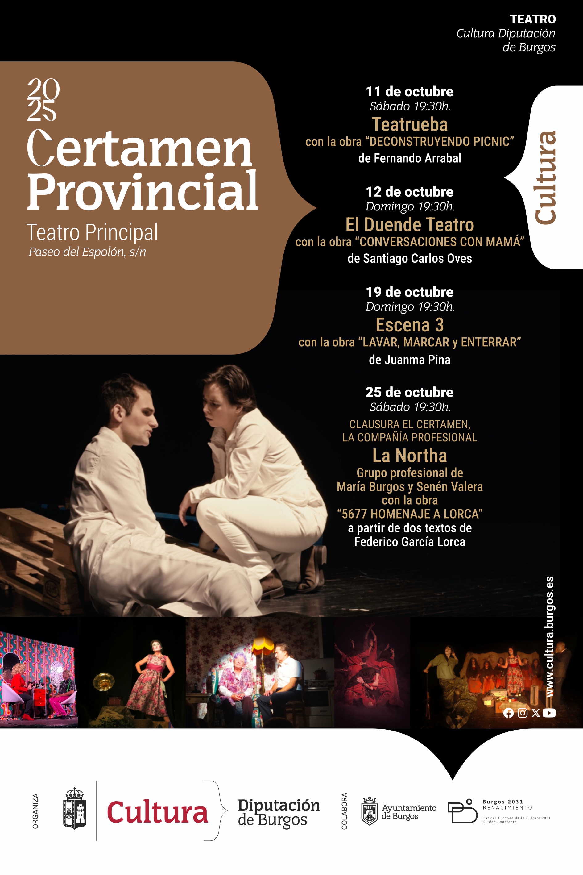 La Diputación Provincial de Burgos, a través de la Unidad de Cultura, está llevando a cabo la organización del CERTAMEN PROVINCIAL DE TEATRO 2025, dirigido a todas las compañías de teatro no profesionales de la provincia de Burgos, preferentemente y Burgos, Aranda y Miranda.