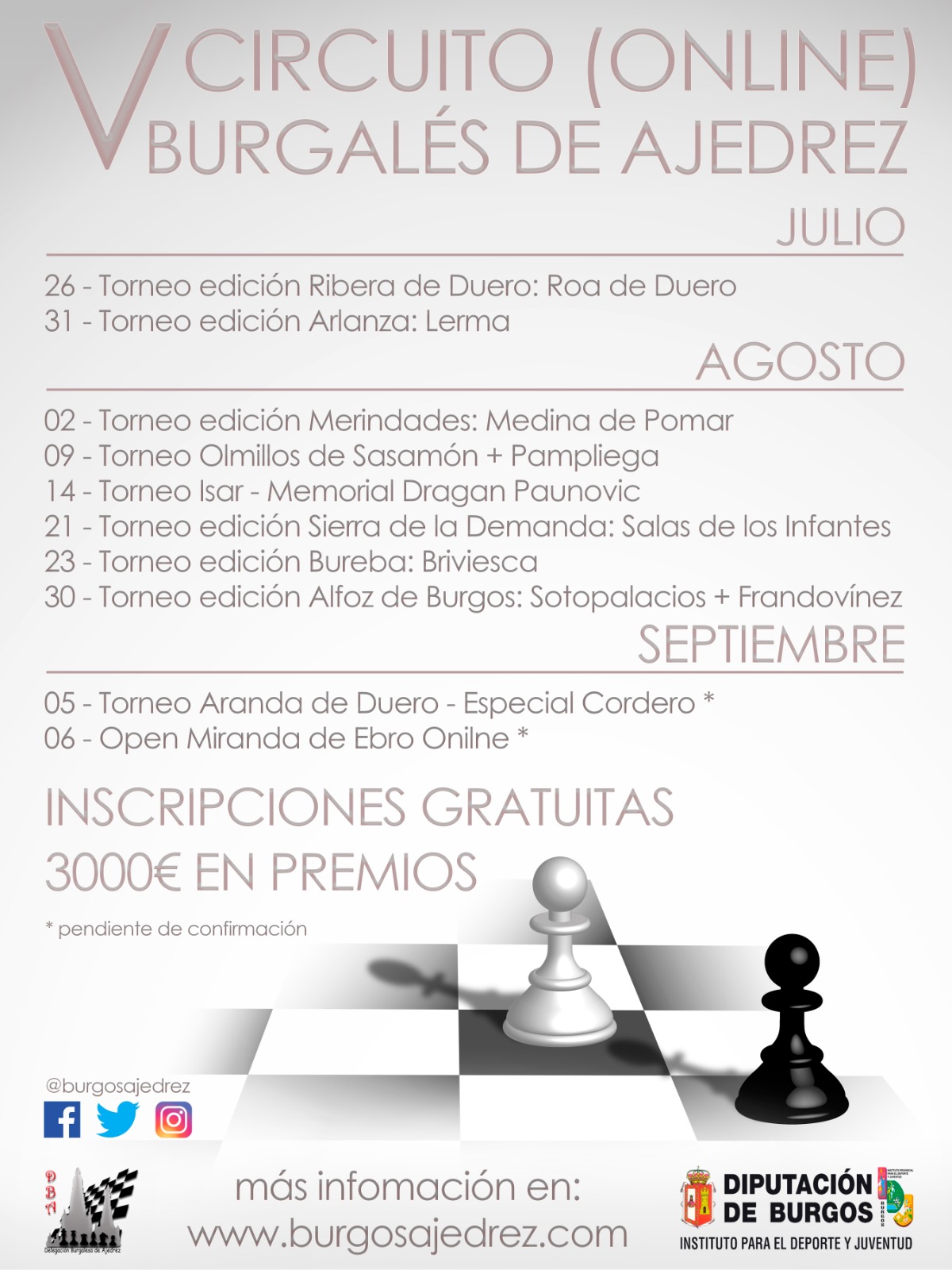 Inscripciones abiertas aquí » hasta el sábado 29 de agosto (antes de hacer la inscripción al Circuito Provincial de Ajedrez, deberá contar con una cuenta en lichess.org, para poder facilitar el nick).