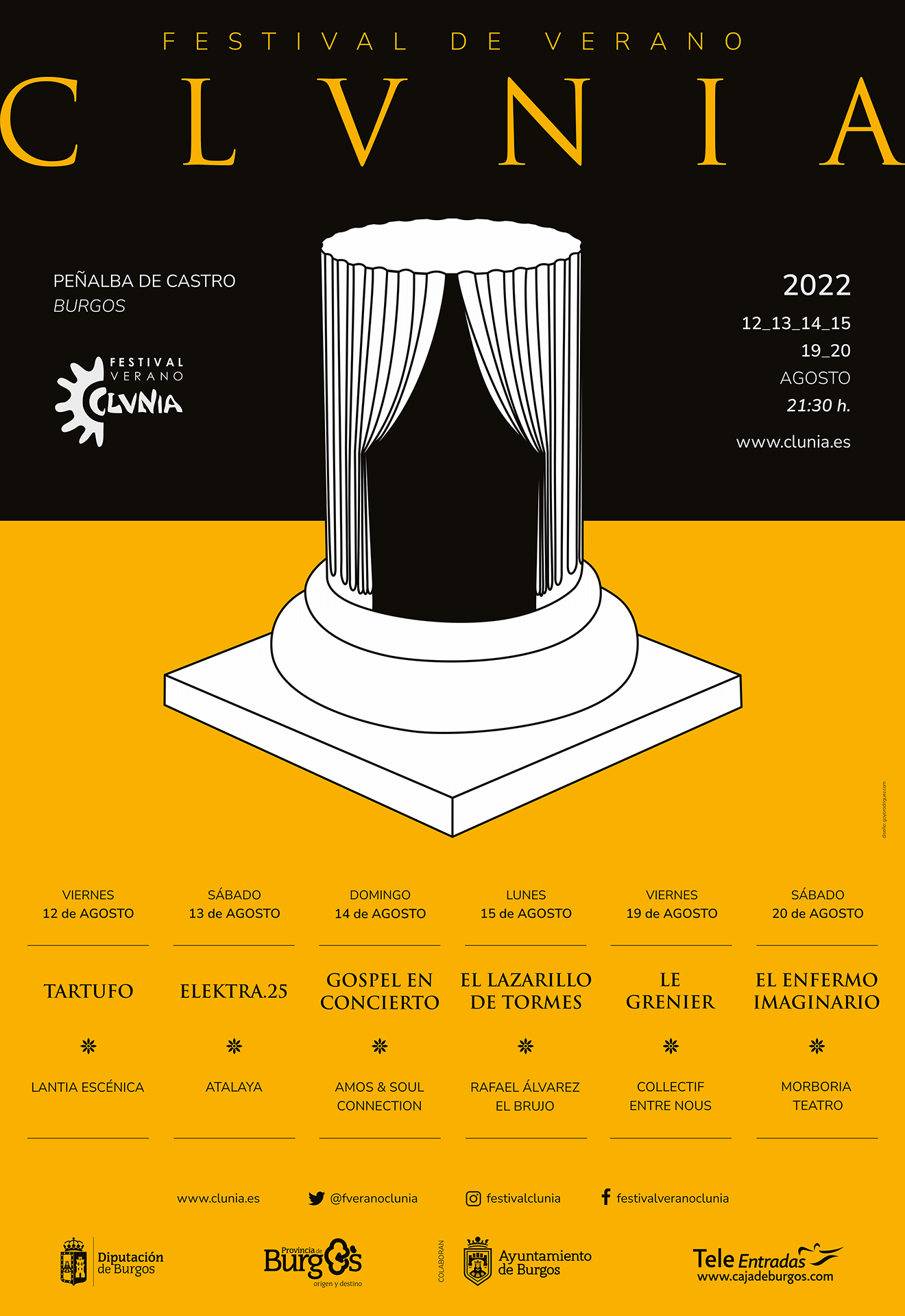 El Festival de Verano de Clunia cumple la XV Edición y, con una programación ampliada a 6 propuestas escénicas, volvemos a ofrecer a los espectadores música, circo y teatro, con una especial atención en este último caso a la figura del dramaturgo universal Molière, que revolucionó la sátira y de cuyo nacimiento se conmemora este año su 400 aniversario.