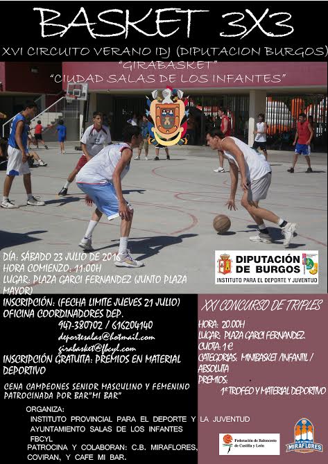 Ya esta aquí el mejor baloncesto 3X3 en Burgos... el día 23 de julio, en Salas de los Infantes, a partir de las 11:00 horas hasta las 19:30 horas en su XVI edición de Girabasket IDJ´16 3X3. Inscripciones (gratuitas) fecha límite el jueves 21 de julio en el teléfono 616204140 o por email: deportesalas@hotmail.com y girabasket@fbcyl.com.