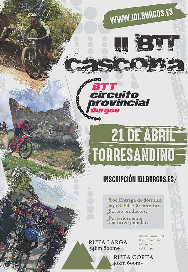 El Ayuntamiento de Torresandino y la Asociación Cultural Recreativa "Torresandino Vive" organizan la II BTT Cascona para bicicleta de montaña, que tendrá lugar el domingo 21 de abril de 2024, con salida y llegada cronometrada en el Frontón Municipal. Será la 3ª prueba puntuable del XIV Circuito Provincial de BTT.