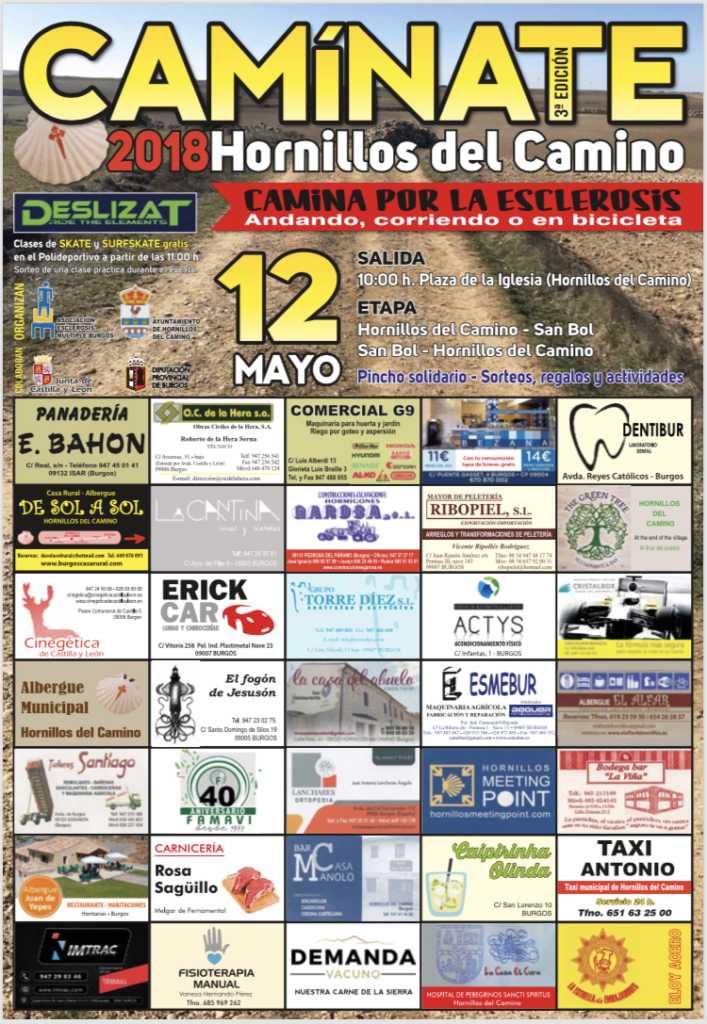 El próximo 12 de mayo, CAMÍNATE 2018 …POR LA ESCLEROSIS en Hornillos del Camino. Andando, corriendo o en bicicleta, saldremos a las 10:00 h. de la Plaza de la Iglesia de Hornillos del Camino y realizaremos una etapa entre esta localidad y la de San Bol.