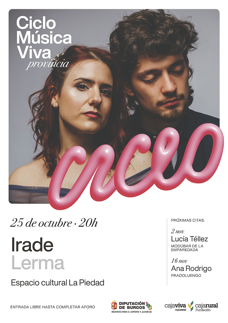 La localidad de Lerma acogerá el cuarto concierto del Ciclo de Música Viva por la Provincia. En esta ocasión, la artista será Irade, que actuará en el Espacio Cultural "La Piedad" a las 20:00 horas el viernes 25 de octubre.
