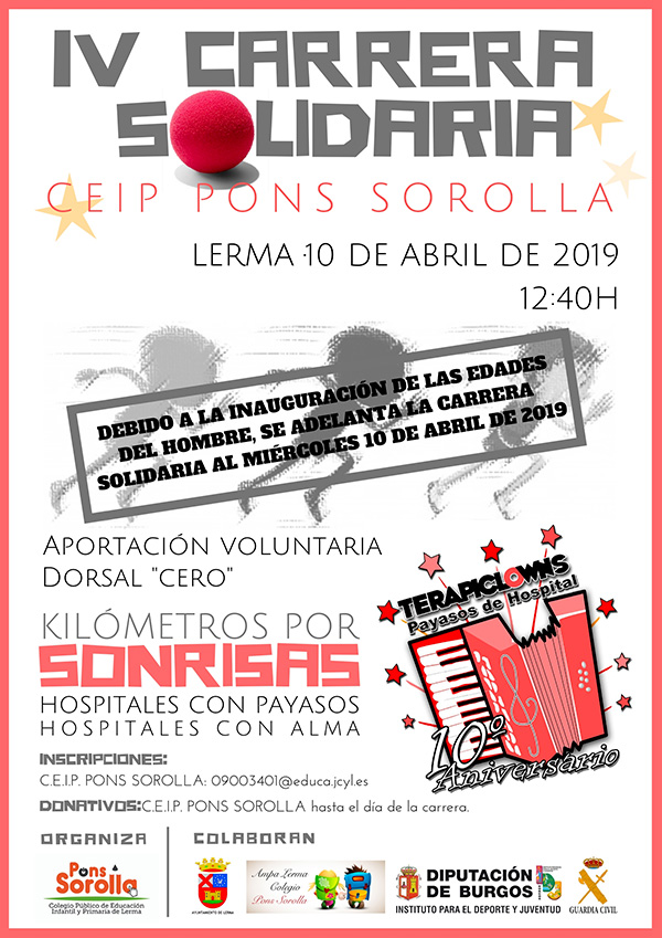 Continuando en la misma línea de sensibilización y ayuda que quieren transmitir desde el centro escolar, este curso destinarán los beneficios de la IV Carrera Solidaria – C.E.I.P. Pons Sorolla, a TERAPICLOWNS “PAYASOS DE HOSPITAL”. Terapiclowns es un servicio de Payasos de Hospital de Burgos en funcionamiento desde el año 2009 que pone en práctica las propiedades terapéuticas de la risa a través del arte del clown en dos áreas hospitalarias: