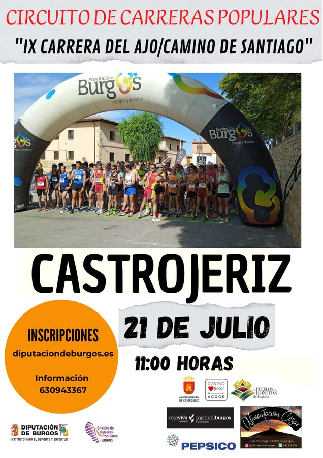 Castrojeriz celebrará la 2ª prueba del XLIII Circuito Provincial de Carreras Pedestres Populares tras la disputa de la primera prueba puntuable en Belorado el pasado 7 de julio. Será con la 9ª edición de la Carrera del Ajo - Camino de Santigo el domingo 21 de julio a las 11:00 horas.