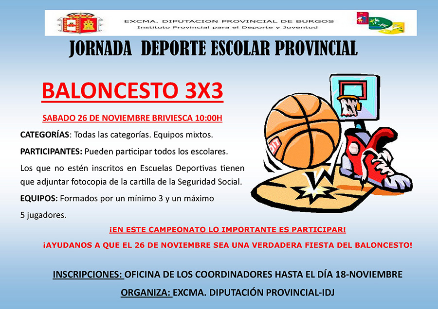 El próximo sábado 26 de noviembre, el Polideportivo Municipal de Briviesca acogerá la primera jornada de Promoción de Baloncesto 3x3 en la que están citados todos los escolares de la Provincia, desde prebenjamines a juveniles.