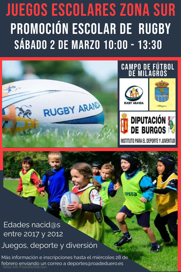 El Campo Municipal de Fútbol de la localidad ribereña de Milagros será el punto de encuentro de los escolares de la zona sur que participarán en una jornada de promoción de rugby, dirigida por el Club de Rugby de Aranda de Duero.