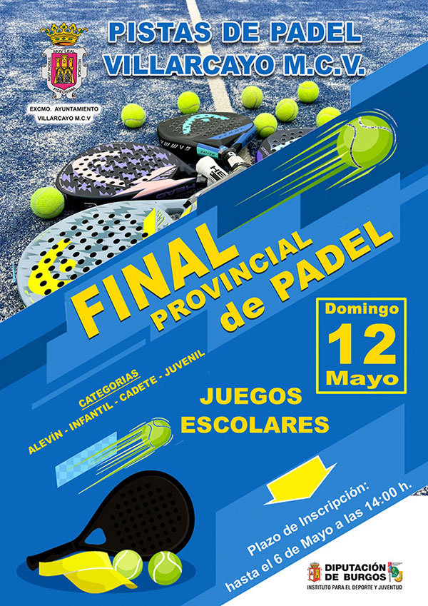 Las pistas de pádel de Villarcayo acogerán la Final Provincial el domingo 12 de mayo a partir de las 10:00 h. y hasta las 16:00 h. Habrá una pareja representante de cada entidad organizadora: 1 Burgos capital, 1 Aranda de Duero, 1 Miranda de Ebro y el resto de los municipios de la provincia.