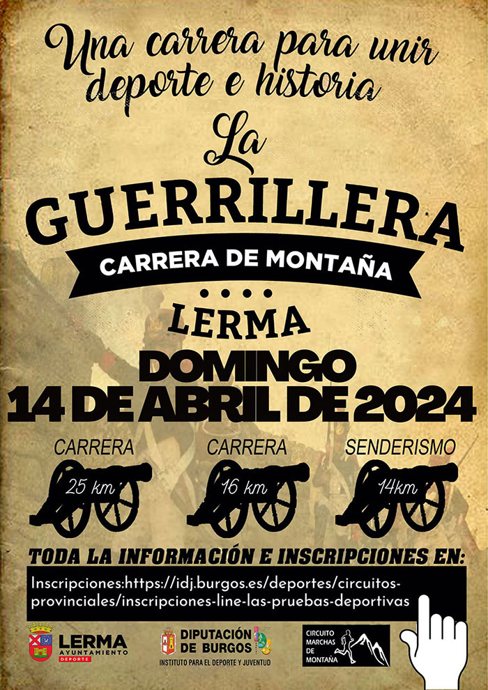 La Carrera de Montaña "La Guerrillera" se celebrará el próximo 14 de abril de 2024 con salida a las 9:30 h de Castrillo de Solarana los senderistas, salida a las 10:00 h en la Plaza Mayor de Pineda Trasmonte los de la carrera larga y a las 10:45 h de la Plaza Mayor de Rabé de los Escuderos los de la carrera corta y llegada todos a la Plaza del Mercado Viejo de Lerma.