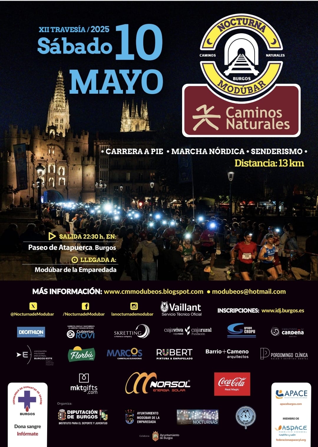 La XII Nocturna de Modúbar - "Caminos Naturales", cuyo recorrido volverá a unir Burgos capital y Modúbar de la Emparedada a través del Camino Natural Santander-Mediterráneo, se celebrará el 10 de Mayo, inaugurando el XI Circuito Provincial de Travesías Nocturnas 2025.