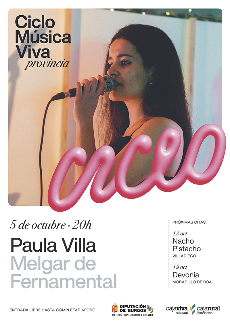 La joven artista burgalesa Paula Villa actuará, a partir de las 20:00 h, en la localidad de Melgar de Fernamental, inaugurando así el Ciclo de Música Viva por la Provincia, organizado por el Instituto Provincial para el Deporte y Juventud y la Fundación Caja Rural-Caja Viva.
