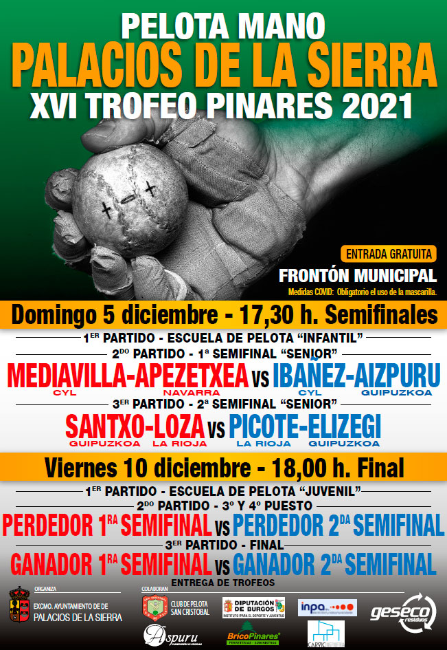 El Frontón Municipal de Palacios de la Sierra será la sede del XVI Trofeo de Pinares 2021 de Pelota a Mano, con la organización de bonitos partidos con jugadores de alto nivel, de varios lugares de la zona norte de nuestro país. La entrada será gratuita para el público, siempre respetando las medidas Covid-19, con el uso obligatorio de la mascarilla.