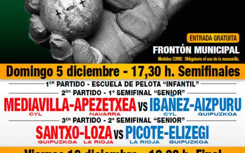 Con la organización del Ayuntamiento de Palacios de la Sierra y la imprescindible colaboración, entre otros, del CP San Cristóbal y la Diputación de Burgos, el domingo día 5 de diciembre a partir de las 17,30 horas, se disputarán las semifinales. Primeramente se jugará el primer partido de exhibición que enfrentará a jugadores en edad infantil de la Escuela de Pelota del CP San Cristóbal. Los enfrentamientos organizados enfrentarán en la primera semifinal sénior a la pareja Mediavilla (Castilla y León) y Apezetxea (Navarra) en contra de Ibáñez (Castilla y León) y Aizpuri (Guipúzcoa). La segunda semifinal, que se disputará seguidamente, enfrentará a la pareja Santxo (Guipúzcoa) y Loza (La Rioja) en contra de Picote (La Rioja) y Elizegi (Guipúzcoa).
