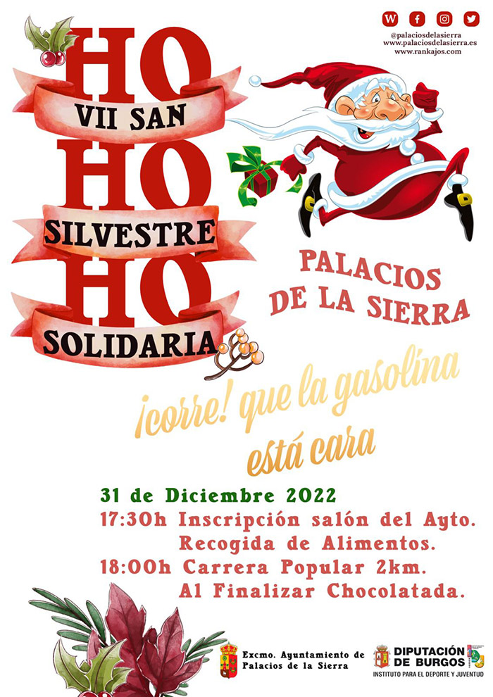 - Palacios de la Sierra. 18:00 h. San Silvestre solidaria. A las 17:30 h se abrirán las inscripciones en el Salón del Ayuntamiento y habrá recogida de alimentos. A las 18:00 h se dará la salida a la carrera popular y al finalizar chocolatada. Distancia: 2 km.