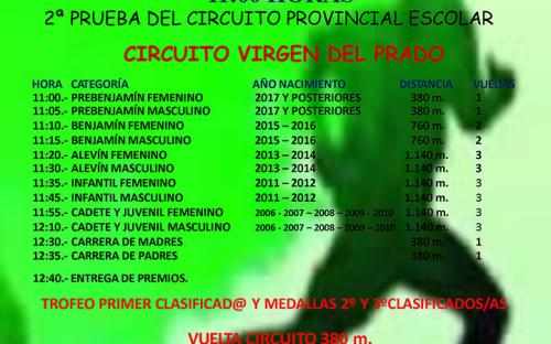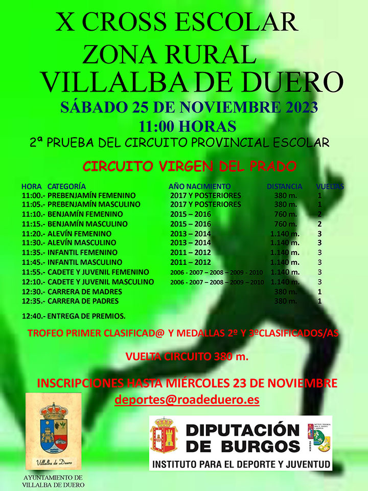 El Circuito "Virgen del Prado" de Villalba de Duero acogerá la segunda de las cinco pruebas puntuables que forman parte del Campeonato Provincial Escolar de Campo a Través. Será el sábado 25 de noviembre a las 11:00 h. Las pruebas que forman parte del Campeonato son: