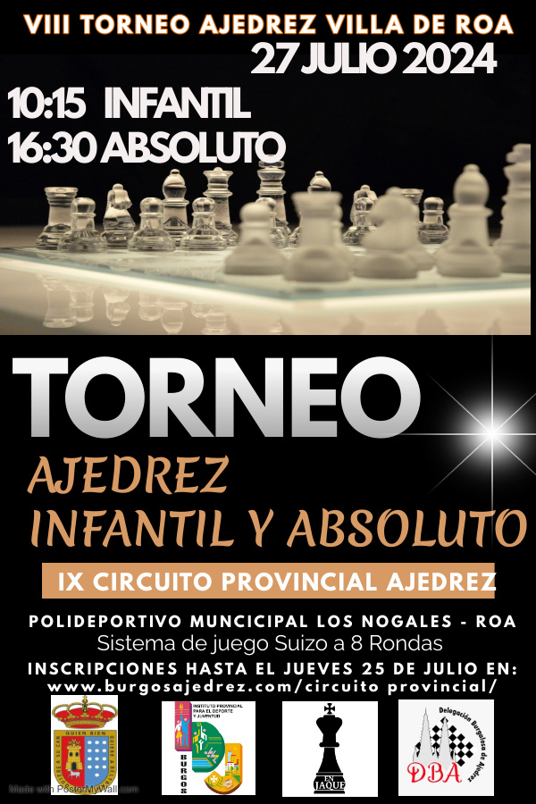 El sábado 27 de julio de 2024 en el Polideportivo "Los Nogales" de Roa se celebrará el VIII Torneo de Ajedrez Villa de Roa perteneciente al IX Circuito Provincial de Ajedrez de Burgos organizado por el Instituto Provincial para el Deporte y Juventud de Burgos. El torneo Infantil comenzará a partir de las 10:15 y el torneo absoluto a partir de las 16:30 horas. Bases del torneo »