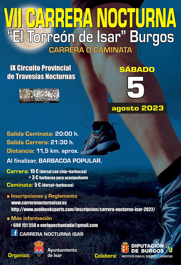 La 7ª edición de la Travesía Nocturna "El Torreón de Isar", que forma parte del IX Circuito Provincial, está organizada por el Ayuntamiento de Isar junto al Instituto Provincial para el Deporte y Juventud de la Diputación Provincial de Burgos. Se celebrará el próximo sábado 5 de agosto de 2023 en las modalidades de carrera y senderismo.