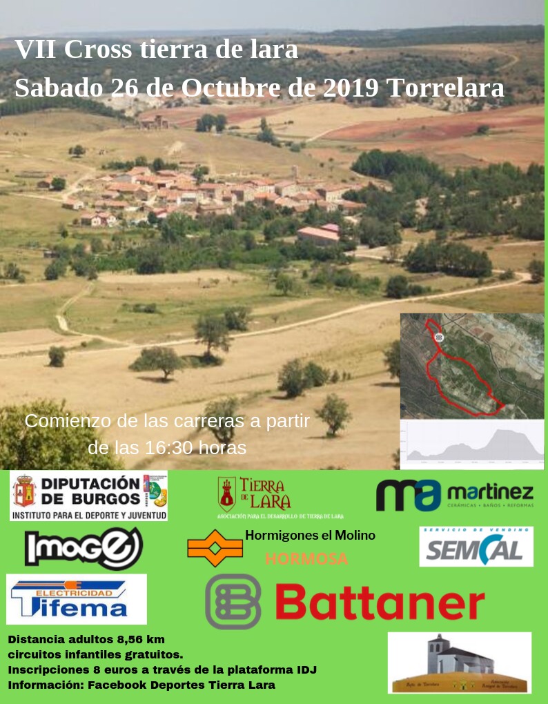 El VII Cross de Tierra Lara, que se celebrará el 26 de octubre de 2019 en el término municipal de Torrelara, está organizado conjuntamente por la Excma. Diputación Provincial de Burgos a través del Instituto para el Deporte y Juventud (IDJ), el Ayuntamiento de Torrelara y la Asociación de Deportes Tierra de Lara.