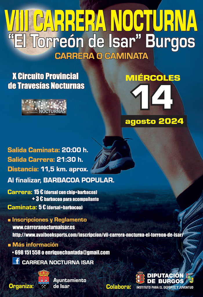 La VIII Travesía Nocturna "El Torreón de Isar" está organizada por el Ayuntamiento de Isar junto al Instituto Provincial para el Deporte y Juventud de la Diputación Provincial de Burgos. Se celebrará el próximo miércoles 14 de agosto de 2024 en las modalidades de carrera y senderismo.