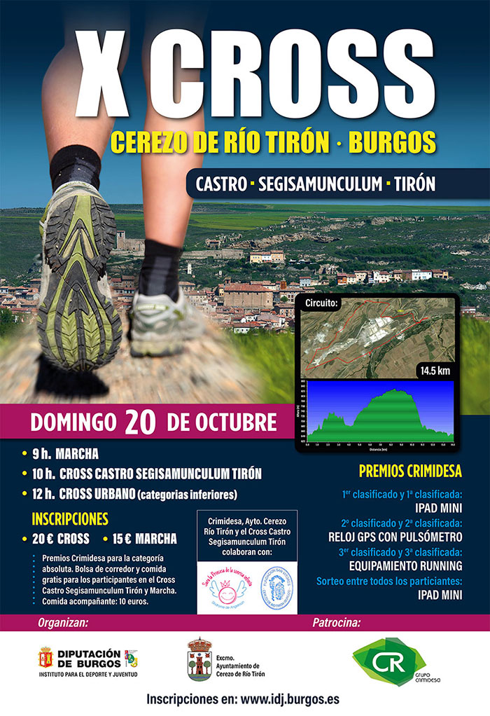 La Asociación Deportiva Cerezo organiza conjuntamente con la Diputación de Burgos, a través del IDJ y el Ayuntamiento de Cerezo de Río Tirón el IX Cross Castro Segisamunculum Tirón, en Cerezo de río Tirón, el domingo 20 de octubre de