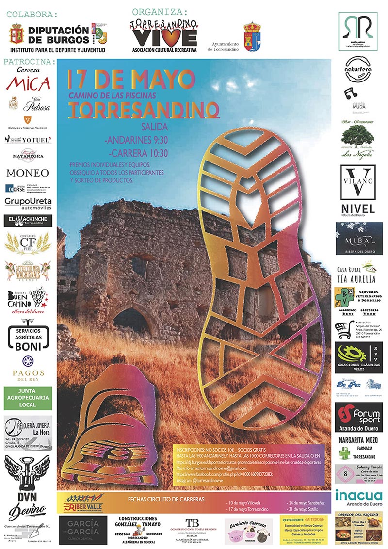La carrera absoluta se celebrará el sábado 17 de mayo de 2025 en Torresandino a las 9:00 horas, con sálida en el Camino de las Piscinas. Las carreras infantiles se celebrarán a partir de las 11:30 horas en el mismo lugar. El evento está organizado por la Asociación Cultural Recreativa Torresandino Vive y el Ayuntamiento de la localidad. También habrá una marcha con la misma distancia que la carrera absoluta: 9 km.