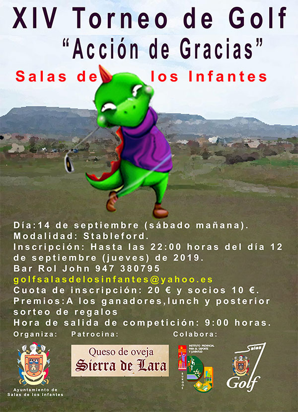 El Ayuntamiento de Salas de los Infantes, con la colaboración del Instituto Provincial para el Deporte y Juventud, Club de Golf Salas de los Infantes y Quesos Sierra de Lara, organizan el XIV Torneo de Golf “Acción de Gracias”. Será el sábado 14 de septiembre a partir de las 09:00 h. en el Campo Rústico de Golf de Santa María de Salas de los Infantes.