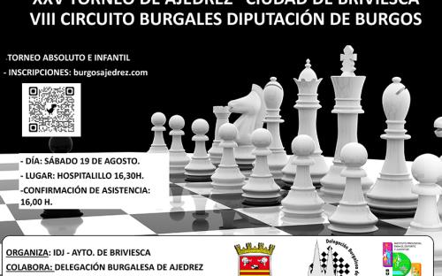 XXV Torneo de Ajedrez "Ciudad de Briviesca", perteneciente al VIII Circuito Provincial, en las categorías absoluta (7ª prueba puntuable) e infantil (4ª prueba puntuable) el sábado 19 de agosto a partir de las 16:30 h. en el Hospitalillo.