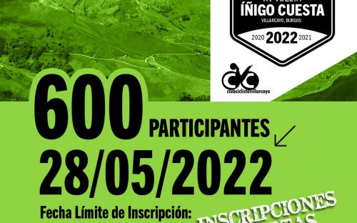 El Club Ciclista Villarcayo organiza la 15ª Marcha Cicloturista Internacional “La Iñigo Cuesta” que tendrá lugar el sábado 28 de mayo de 2022 a las 08:30 h., con salida y llegada en el Polideportivo Municipal de Villarcayo (Burgos). La Marcha Iñigo Cuesta es una marcha ciclo deportiva que concibe este deporte como un ejercicio físico con fines de ocio y turísticos, excluyendo la competición, aunque dentro de horario establecido de principio, fin y puntos de paso.