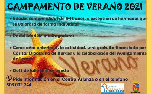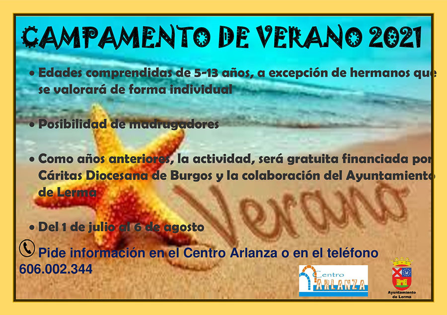 Se abre el plazo de inscripción para el Campamento de Verano "Centro Arlanza 2021" dirigido a niños de 5 a 13 años. Se llevará a cabo del 1 de julio al 6 de agosto en horario de 10:00 a 13:45 h., aunque también existe la opción "madrugadores" a partir de las 09:00 h.