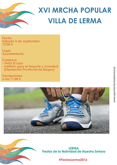 El pasado sábado se celebró en Lerma, como todos los años por estas fechas, la Marcha Popular de las Fiestas Mayores del municipio. Se trata de una prueba deportiva por las calles de la localidad y que acoge varias categorías y desarrollada por la Peña El Lazo. La salida tuvo lugar a las 12:00 h. en la Plaza Mayor y la entrega de trofeos se produjo en la puerta del Consistorio Lermeño.