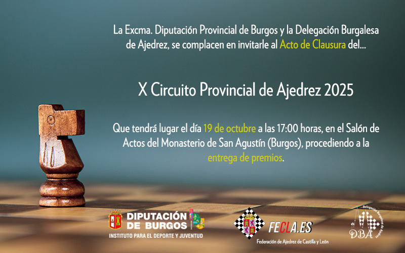 Ya por la tarde, a las 17.00 horas en el Monasterio de San Agustín (Burgos), se celebrará la ceremonia de clausura del X Circuito Burgalés de Ajedrez, con la entrega de premios a los mejores clasificados en las categorías absoluta e infantil.