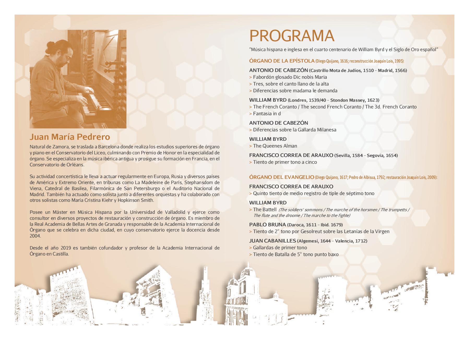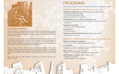 El concierto se celebró en la Colegiata de San Pedro, en Lerma. El organista Juan María Pedrero fue el encargado de interpretar un programa basado en la "Música hispana e inglesa en el cuarto centenario de William Byrd y el Siglo de Oro español", con obras de autores tan destacados como Antonio de Cabezón, William Byrd o Francisco Correa de Arauxo.