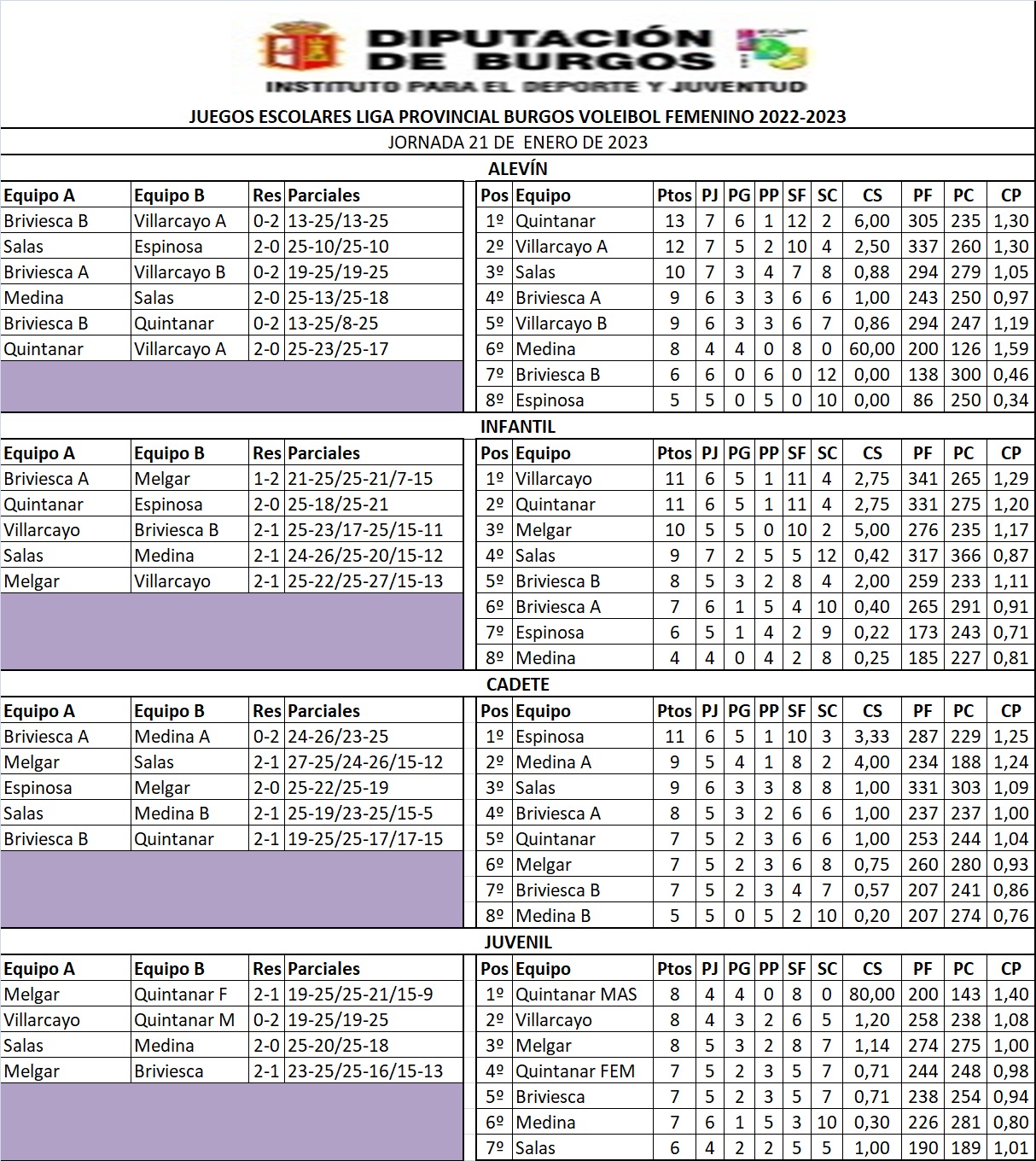 Este pasado sábado 21 de enero se celebró en Briviesca la 4ª jornada de la Liga Escolar Provincial de Voleibol escolar. La igualdad continúa siendo la tónica predominante en la mayoría de las clasificaciones, siendo muy poquitos los equipos que quedan invictos: Medina en categoría alevín, Melgar en infantil y el juvenil masculino de Quintanar.