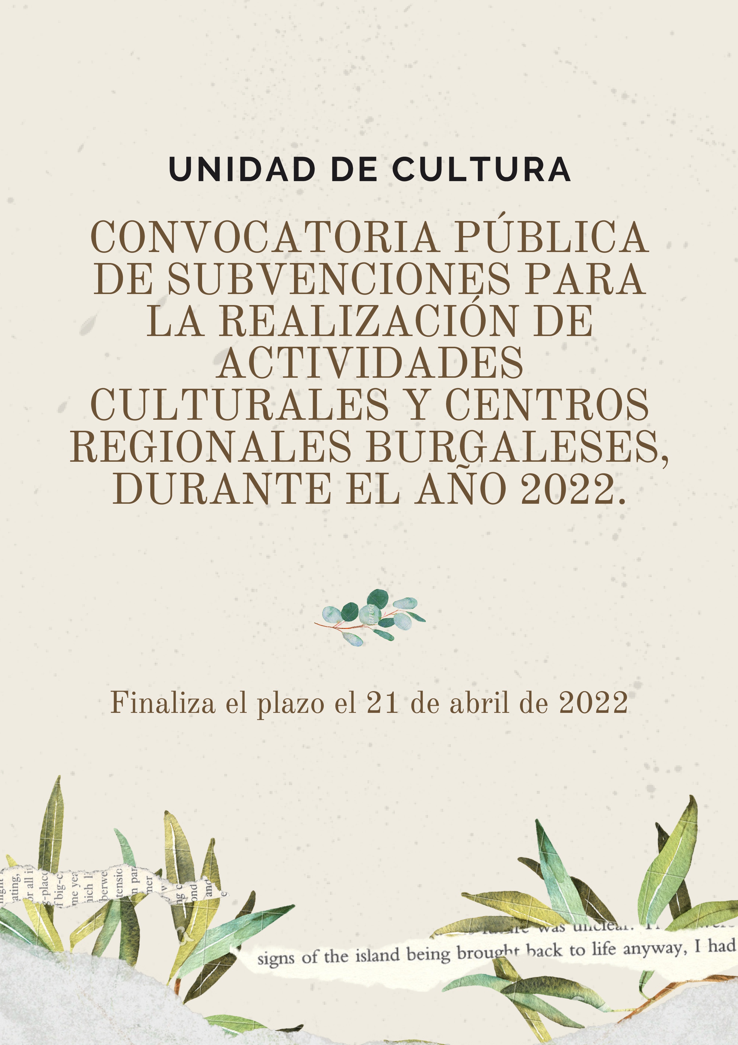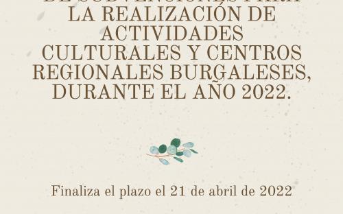 Con fecha 22 de marzo de 2022 se publica en el Boletín Oficial de la Provincia la Convocatoria pública de subvenciones para la realización de actividades culturales por parte de las Asociaciones Culturales y Centros Regionales burgaleses, durante el año 2022.