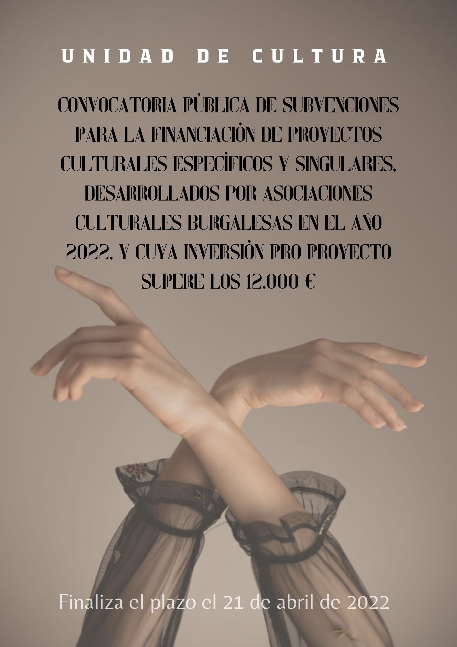 Con fecha 22 de marzo de 2022 se publica en el Boletín Oficial de la Provincia la Convocatoria pública de subvenciones para la financiación de proyectos culturales específicos y singulares, desarrollados por asociaciones culturales burgalesas en el año 2022, y cuya inversión por proyecto cultural supere los 12.000 €.
