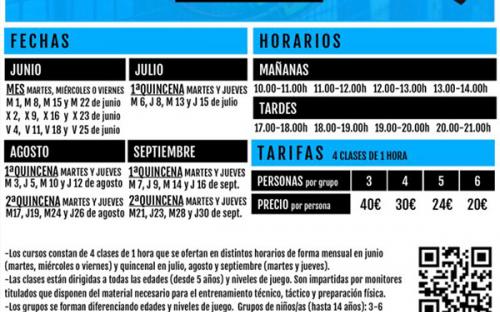 Los cursos constan de 4 clases de 1 hora de duración que se ofertan en distintos horarios de forma mensual en junio (martes, miércoles o viernes) y quincenal en julio, agosto y septiembre (martes y jueves). Las clases están dirigidas a todas las edades (desde 5 años) y niveles de juego.