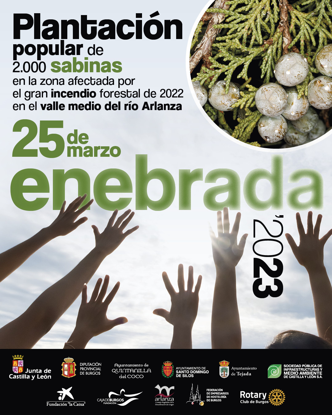 El enebro o sabina es el árbol más frecuente en el valle medio del río Arlanza, que fue la zona más afectada por el gran incendio que, iniciado el 24 de julio del año pasado, devoró más de 2.500 hectáreas de la comarca. Por ello, con motivo de la celebración del Día Internacional de los Bosques, el próximo sábado 25 de marzo se realizará una gran plantación popular de 2.000 sabinas en dicha zona en lo que ya se conoce como la "Enebrada 2023".