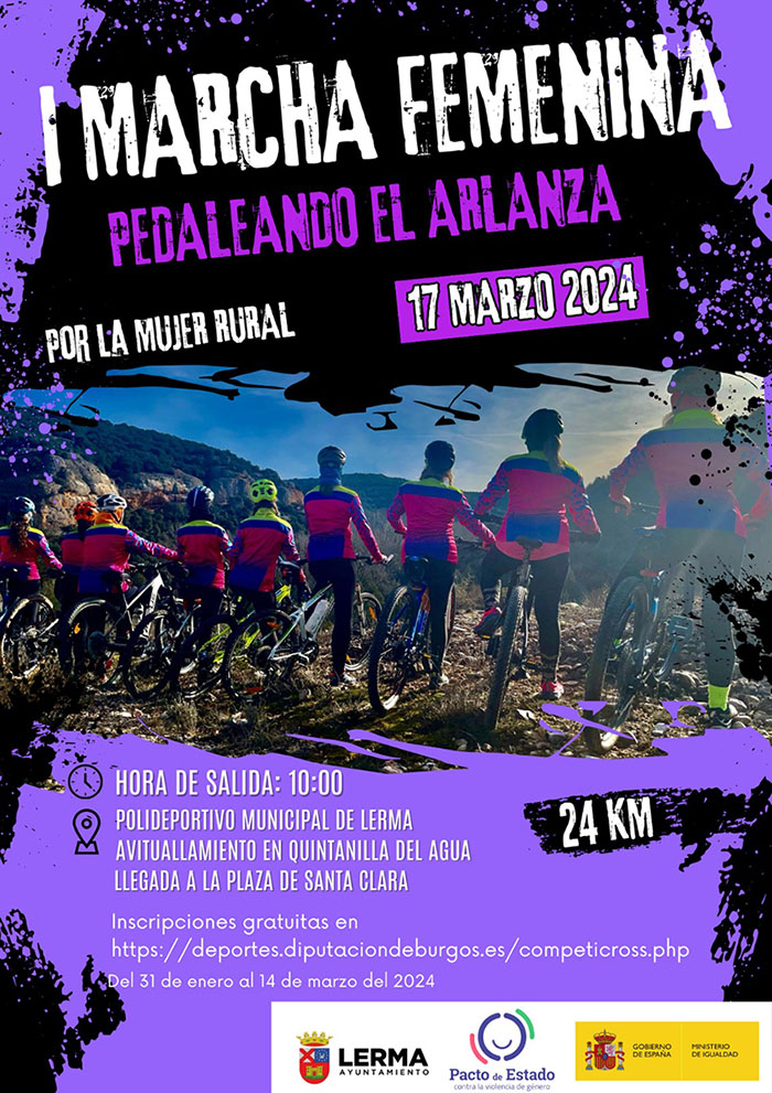 La I Marcha Femenina en Bici denominada "Pedaleando el Arlanza" se celebrará el próximo 17 de Marzo de 2024 con salida a las 10:00 del Polideportivo Municipal de Lerma y llegada a la Plaza Sta. Clara junto al Ayuntamiento. La modalidad es única, femenina para mayores de 18 años y a partir de 16 años con autorización firmada por padre, madre o tutor legal.