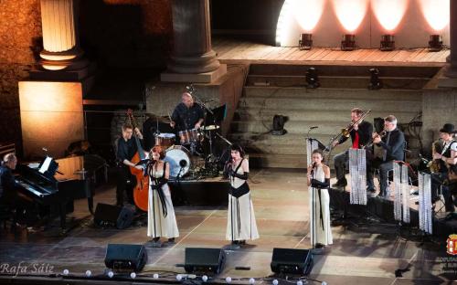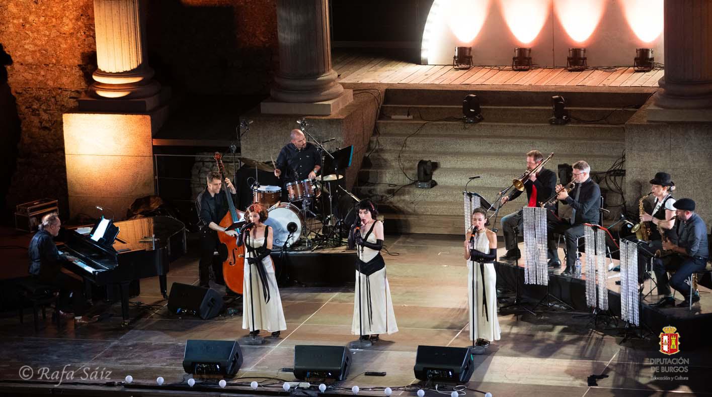 Las voces de Divinas acompañadas de su banda de músicos, transportaron a los público de Clunia a través de un espléndido viaje musical por los paisajes rítmicos de los años 40 y 50 en Estados Unidos. El glamour y savoir faire de las grandes orquestas de la época dorada del swing fue el hilo conductor de un repertorio interpretado de manera sólida, seductora y sofisticada, con toques de humor y diversión... y con el baile como aliado.
