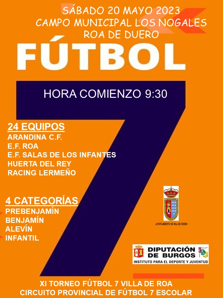 El sábado 20 de mayo a partir de las 9:30 y hasta las 14:00 horas, en el Campo Municipal de Fútbol Los Nogales de Roa, se celebrará el XI Torneo de Futbol 7 Villa de Roa, perteneciente al Circuito Provincial Escolar de Fútbol 7.