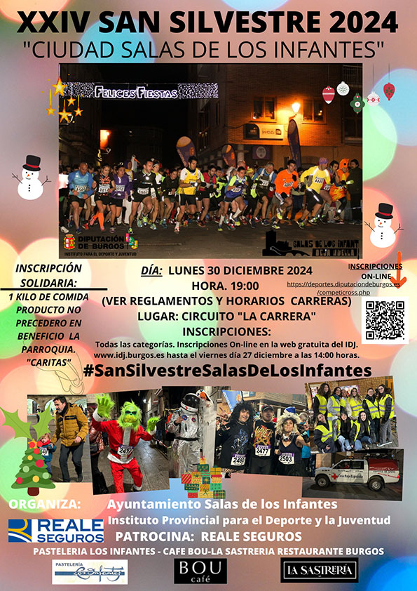 Salas de los Infantes celebrará su tradicional San Silvestre el lunes 30 de diciembre de 2024 a partir de las 19:00 horas sobre un circuito urbano. La carrera se llevará a cabo en todas sus categorías, desde chupetines a veteranos y en las modalidades masculina y femenina.